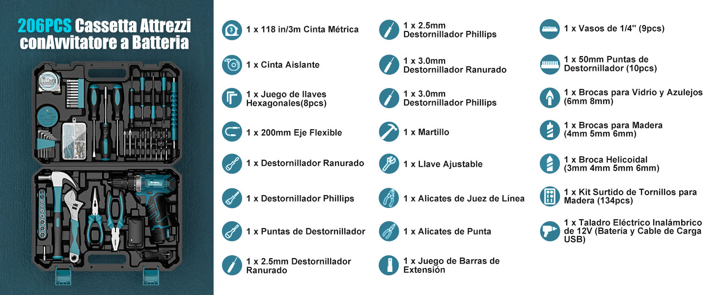 Sundpey Taladro Atornillador 12V - Caja Herramientas Completa 206 Piezas con Taladro Eléctrico Compacto, Juego Herramientas para el Hogar, Bricolaje, para Reparación de Casas, Oficinas y Jardines